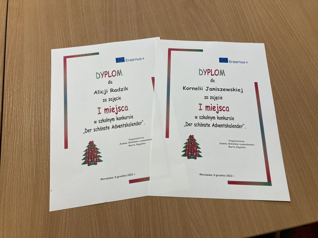 Nasz konkurs polegał na wykonaniu leksykalno–gramatycznego kalendarza adwentowego. Poszczególne okienka kalendarza miały zawierać własnoręcznie wykonane niespodzianki (np. sentencje związane ze świętami, przysłowie związane z zimą, fragmenty kolęd, zwroty w języku niemieckim, związane z adwentem i świętami Bożego Narodzenia).