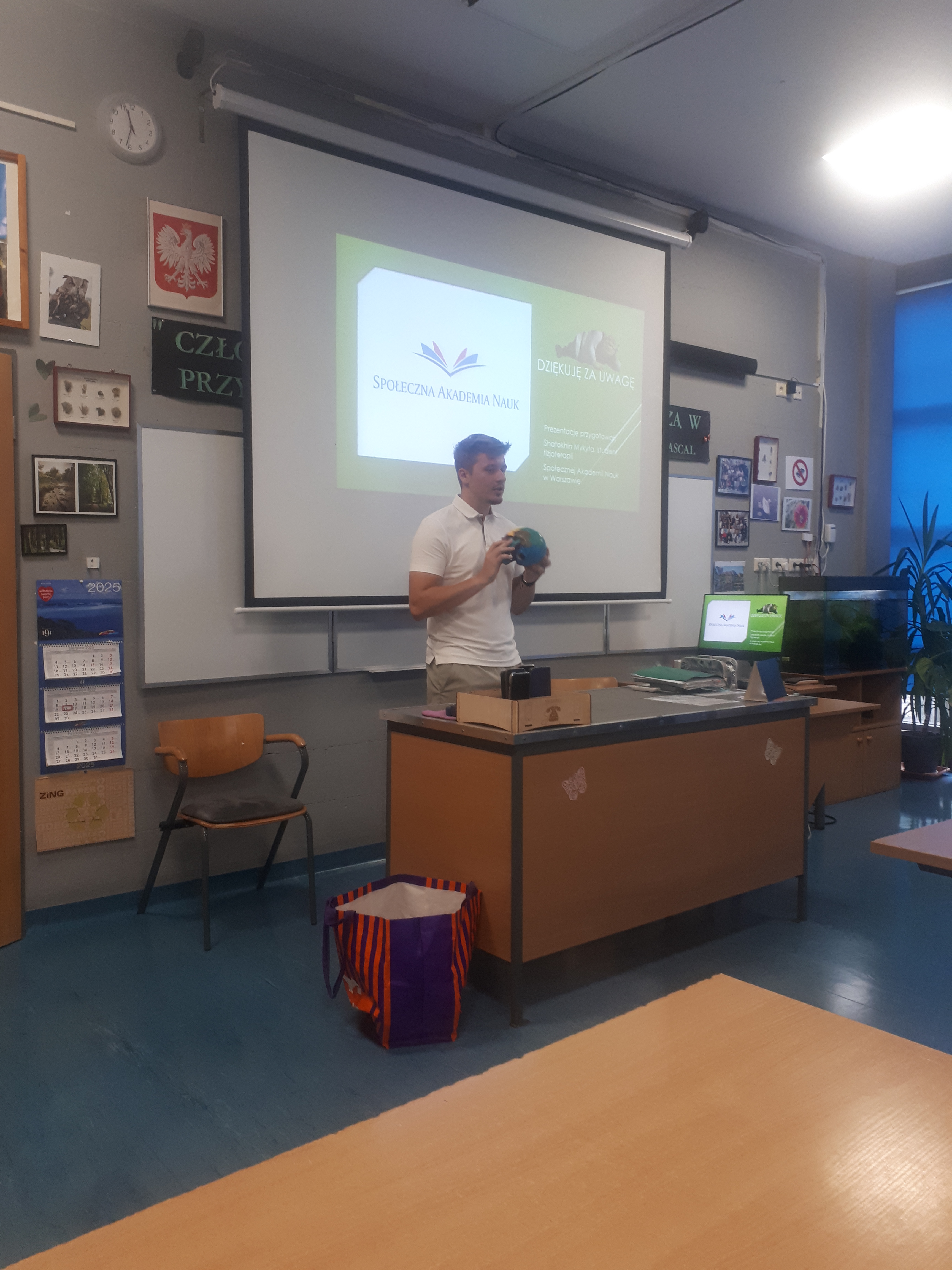Klasy biologiczno-chemiczne (drugie, trzecie i czwarte) 17 września 2025 roku miały okazję uczestniczyć w naszej szkole w spotkaniu ze studentem drugiego roku fizjoterapii ze Społecznej Akademii Nauk. Studentem ,który obszernie zaprezentował ofertę uczelni jest nasz absolwent liceum Nikita Shatokhin. Jego spotkanie z młodzieżą zwiększyło świadomość dotyczącą możliwości zawodowych jakie daje ukończenie fizjoterapii. Spora grupa uczniów przestała ten kierunek utożsamiać tylko z rehabilitacją. Prowadzący łatwo nawiązał kontakt z uczniami, chętnie zadawali pytania. Młodzież pozyskała tez wiedzę ,jak ważna jest systematyczność w uczeniu się, która procentuje na studiach. W trakcie spotkania podzielił się też własną historią, która wzmocniła przekaz zajęć.